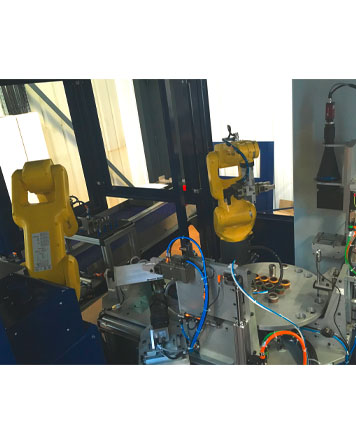 Un premier robot charge et décharge les pièces et 2 autres robots manipulent les pièces sur différents posages ou plateaux de contrôle dans la cellule. Les pièces 100% contrôlées sont directement évacuées sur des plateaux thermoformés. Cette solution technique permet la flexibilité, la performance du contrôle ainsi qu'une cadence élevée.