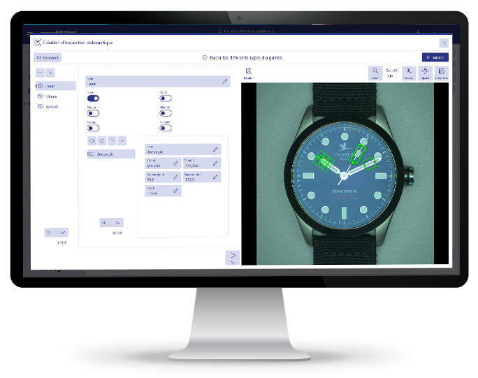 Un nouvel assistant à la création d’inspections de mesure vous guide pour configurer votre montre ou mouvement en un minimum de temps sans effort. Il intègre des outils vision et algorithmes améliorés intégrant l’intelligence artificielle pour un taux de lecture performant. Les inspections de mesure sont versionnées avec traçabilité des changements.